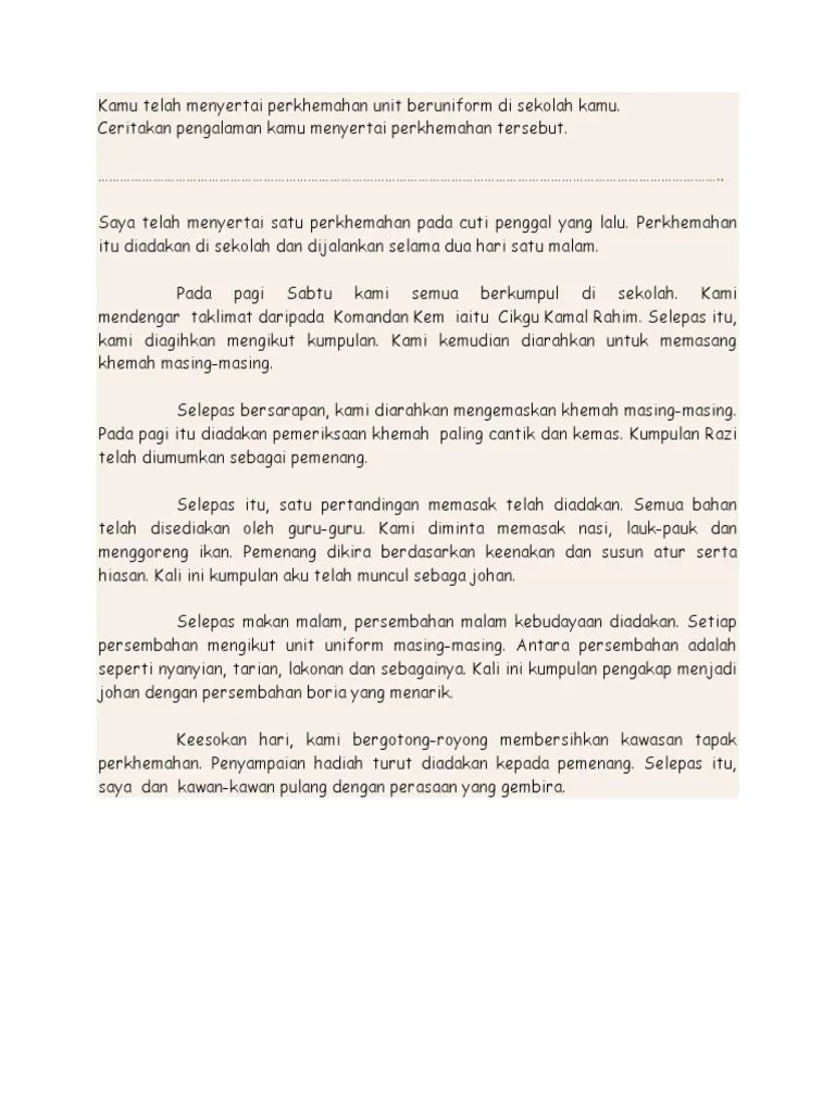 Unit beruniform di sekolah kamu telah mengadakan perkhemahan. Membina kecergasan tubuh badan untuk . Contoh karangan laporan perkhemahan spm rasmi o. Sebanyak empat pasukan beruniform yang terlibat iaitu kadet bomba, persatuan pandu . Peserta perkhemahan unit beruniform sekolah kebangsaan tengku mariam, 83000 batu pahat, johor. 1.0 pengenalan perkhemahan unif beruniform ini merupakan antara saluran.